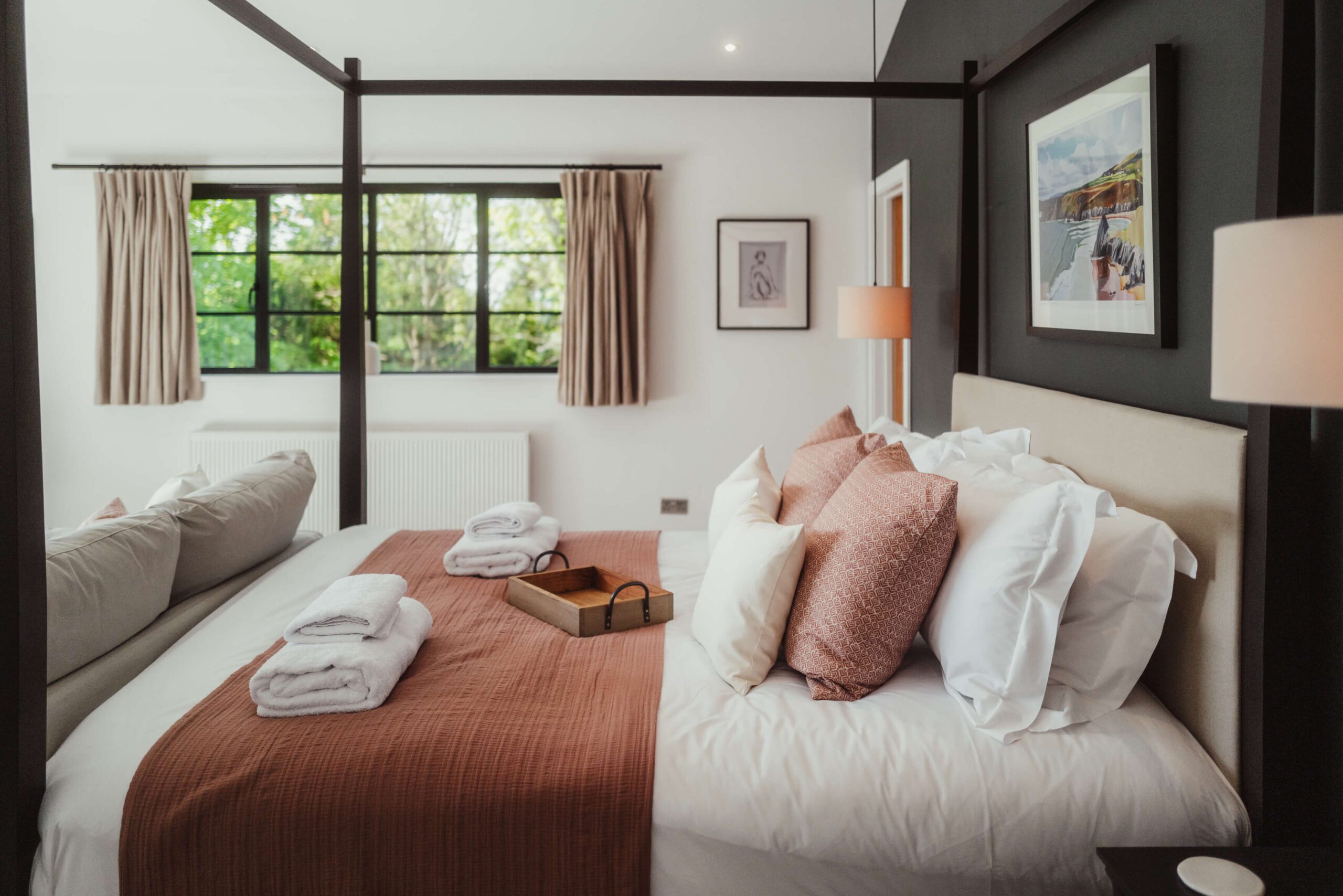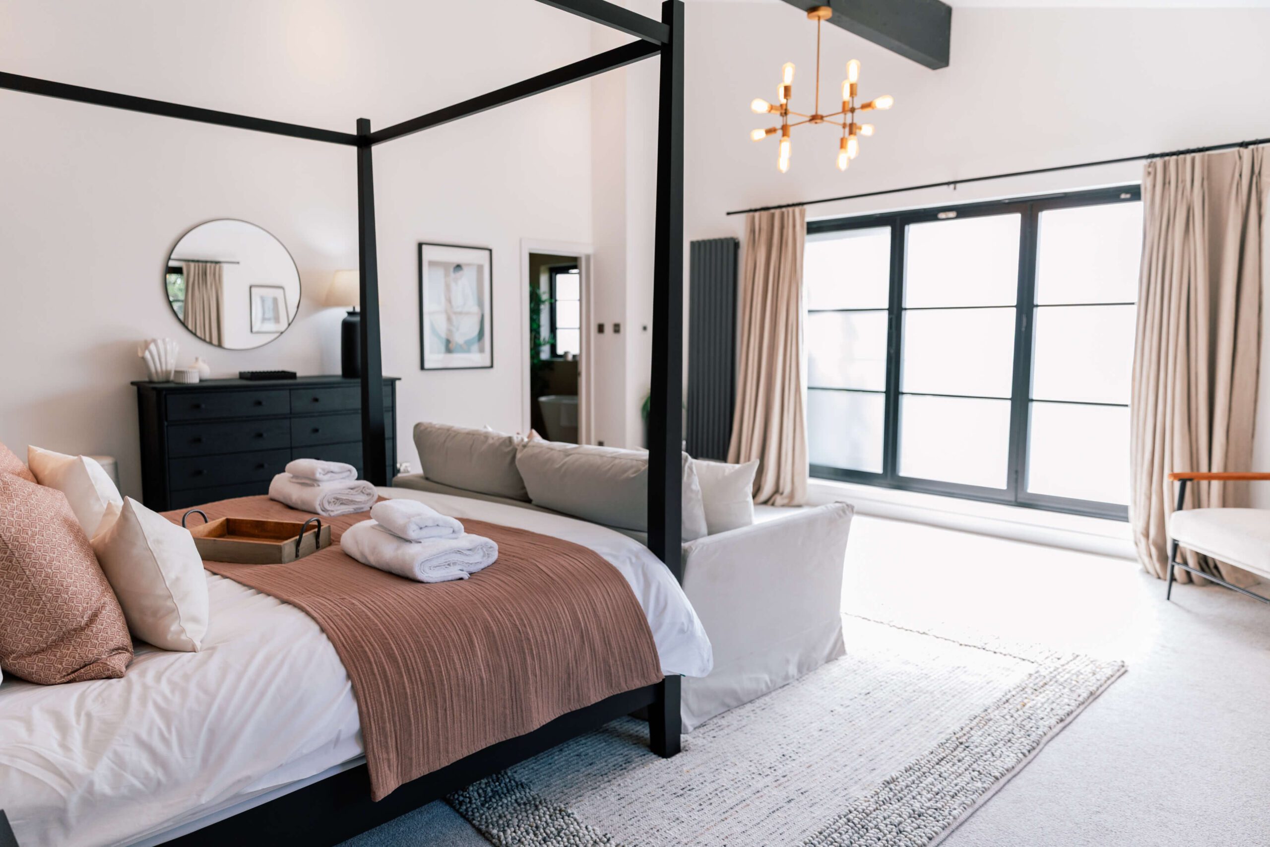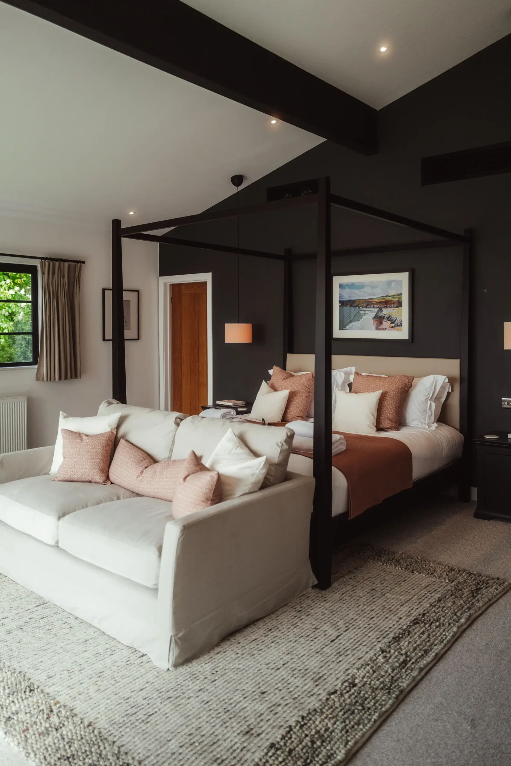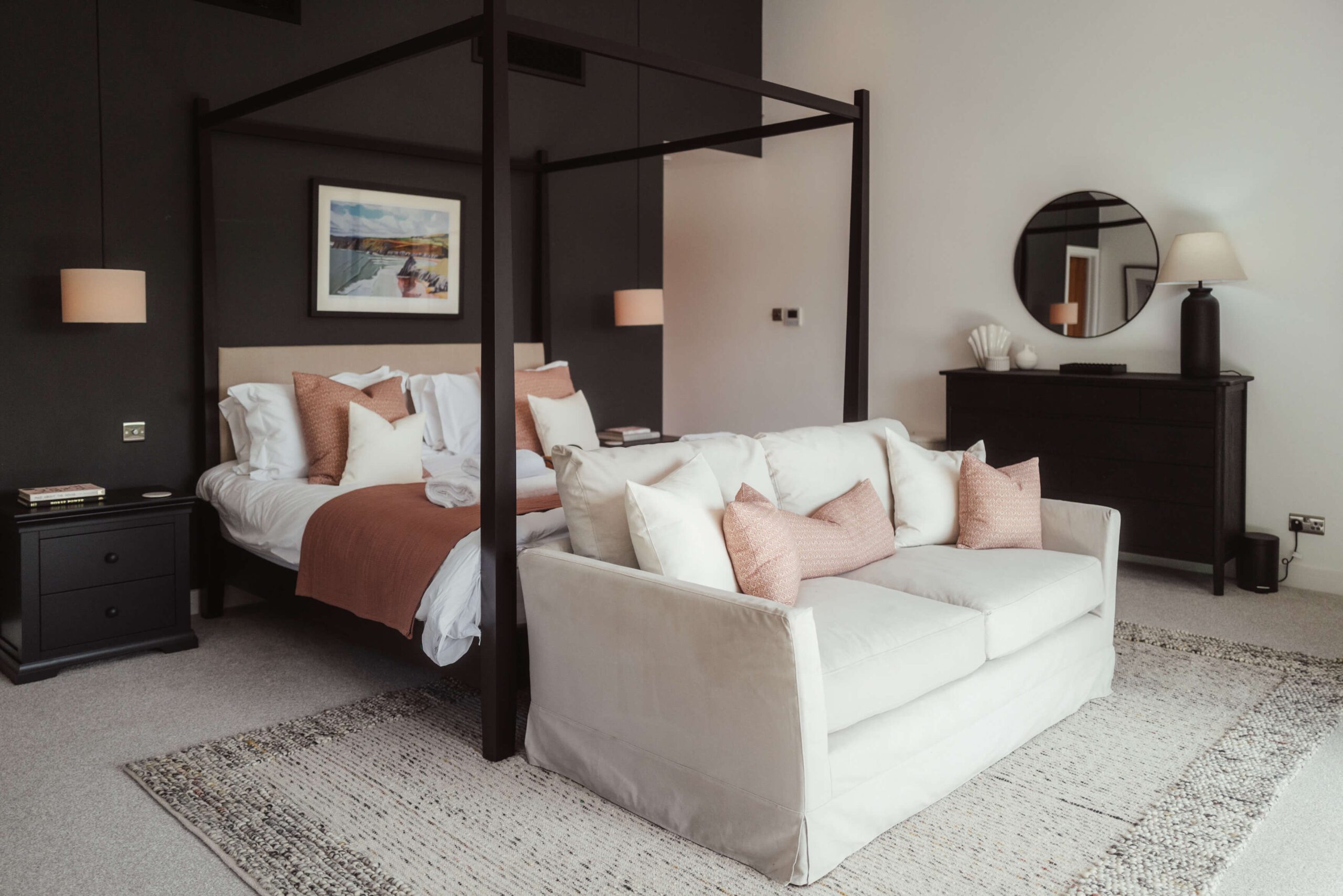 Our design approach focused on balancing bold statements with soft, welcoming touches. Terracotta pink cushions and a textured neutral rug softened the walls and dark feature wall, while a cream sofa and subtly colored artwork added comfort and personality. This master bedroom is part of a five-bedroom luxury Airbnb retreat, where every detail was carefully curated to feel both stylish and homely.