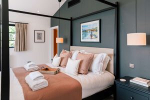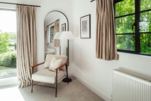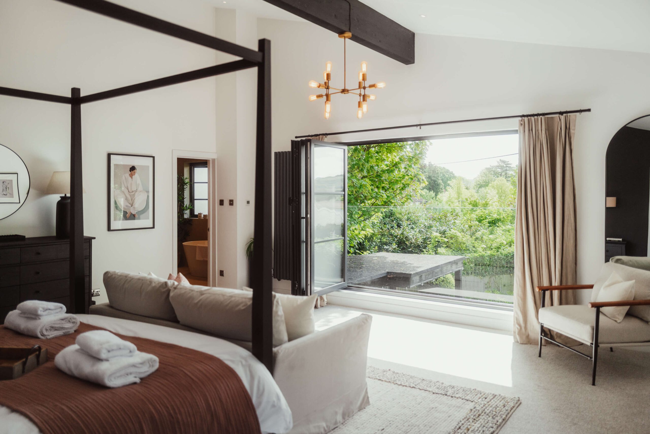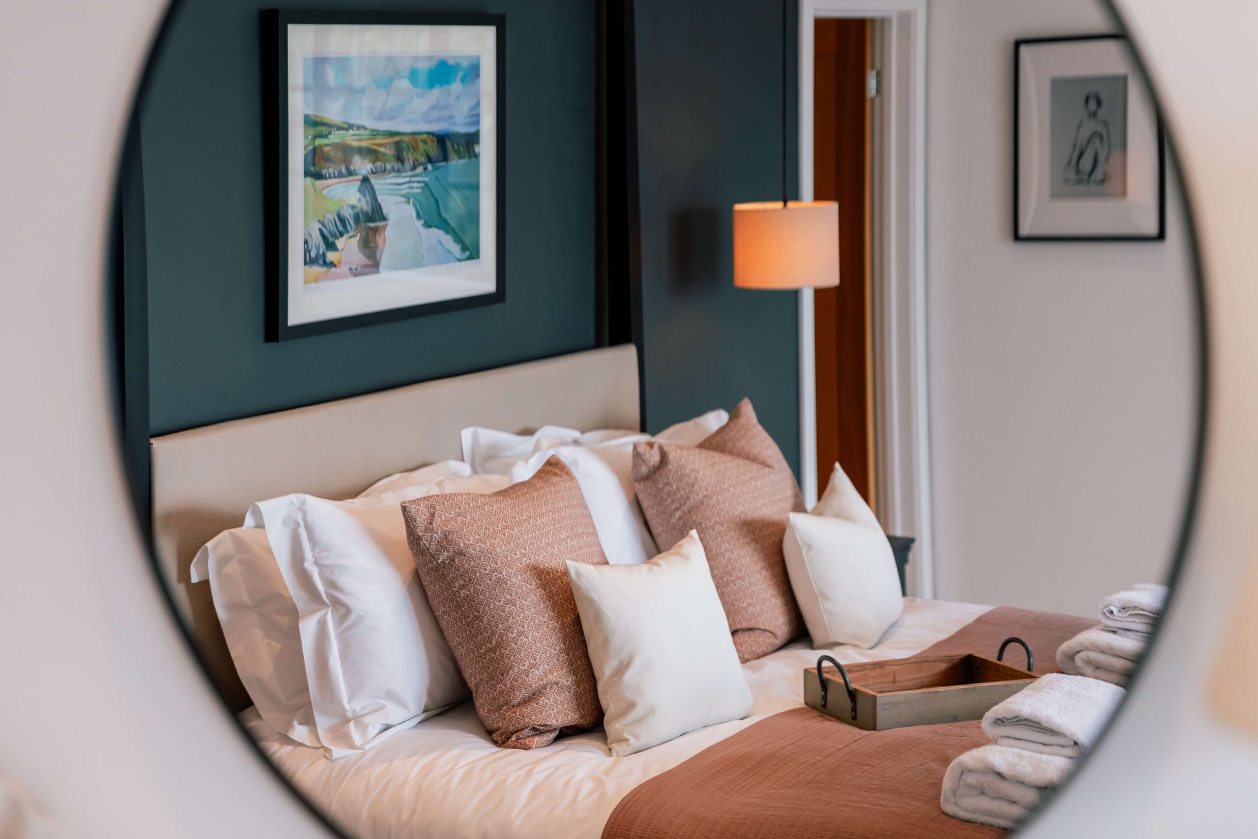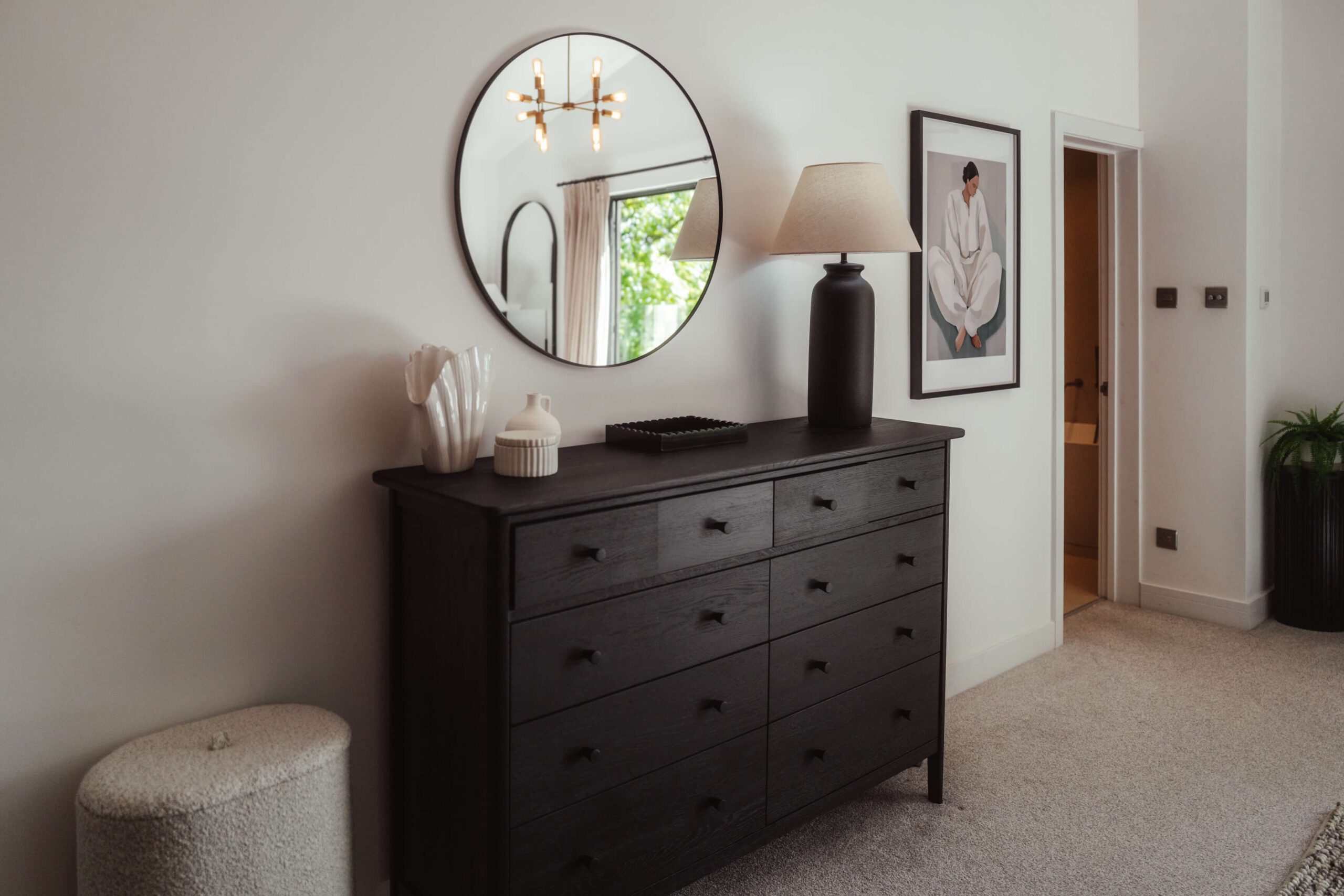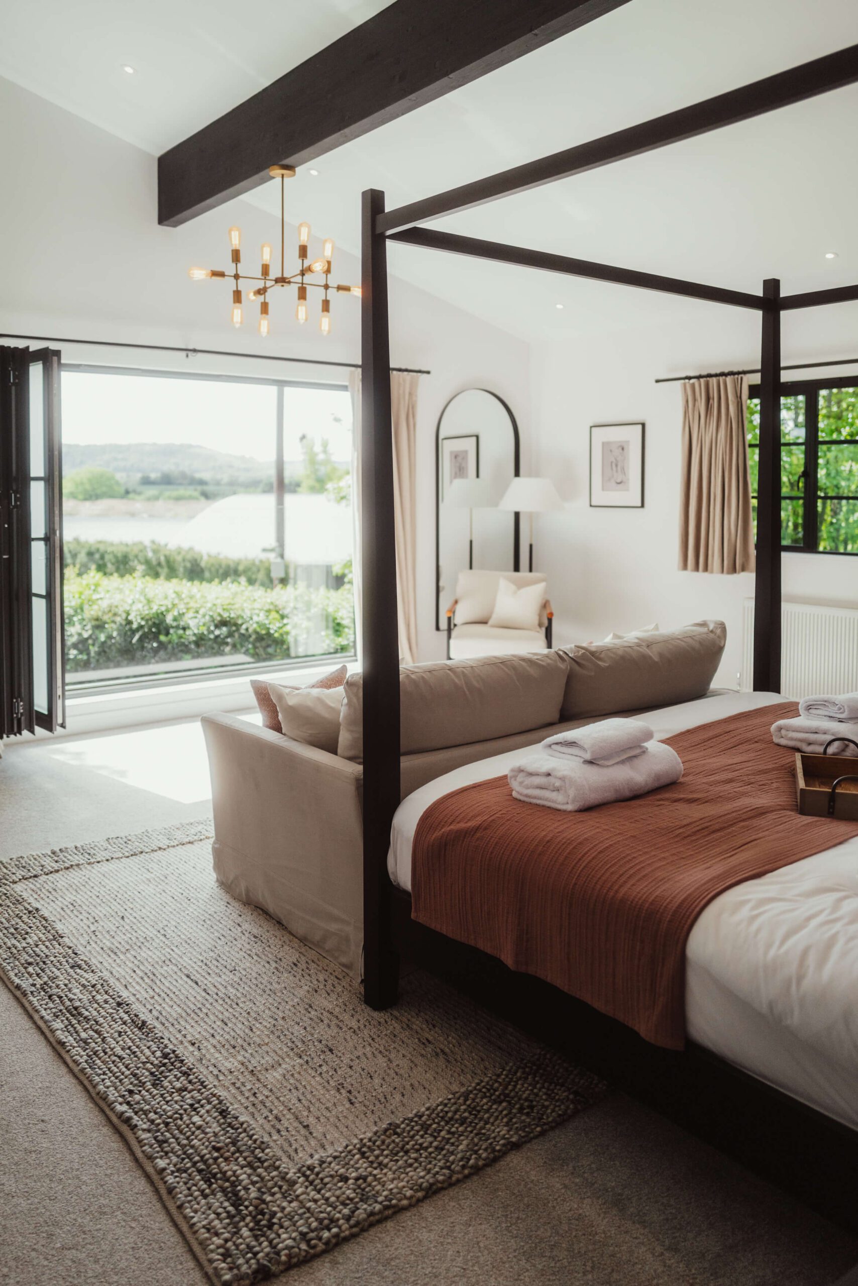 Our design approach focused on balancing bold statements with soft, welcoming touches. Terracotta pink cushions and a textured neutral rug softened the walls and dark feature wall, while a cream sofa and subtly colored artwork added comfort and personality. This master bedroom is part of a five-bedroom luxury Airbnb retreat, where every detail was carefully curated to feel both stylish and homely.