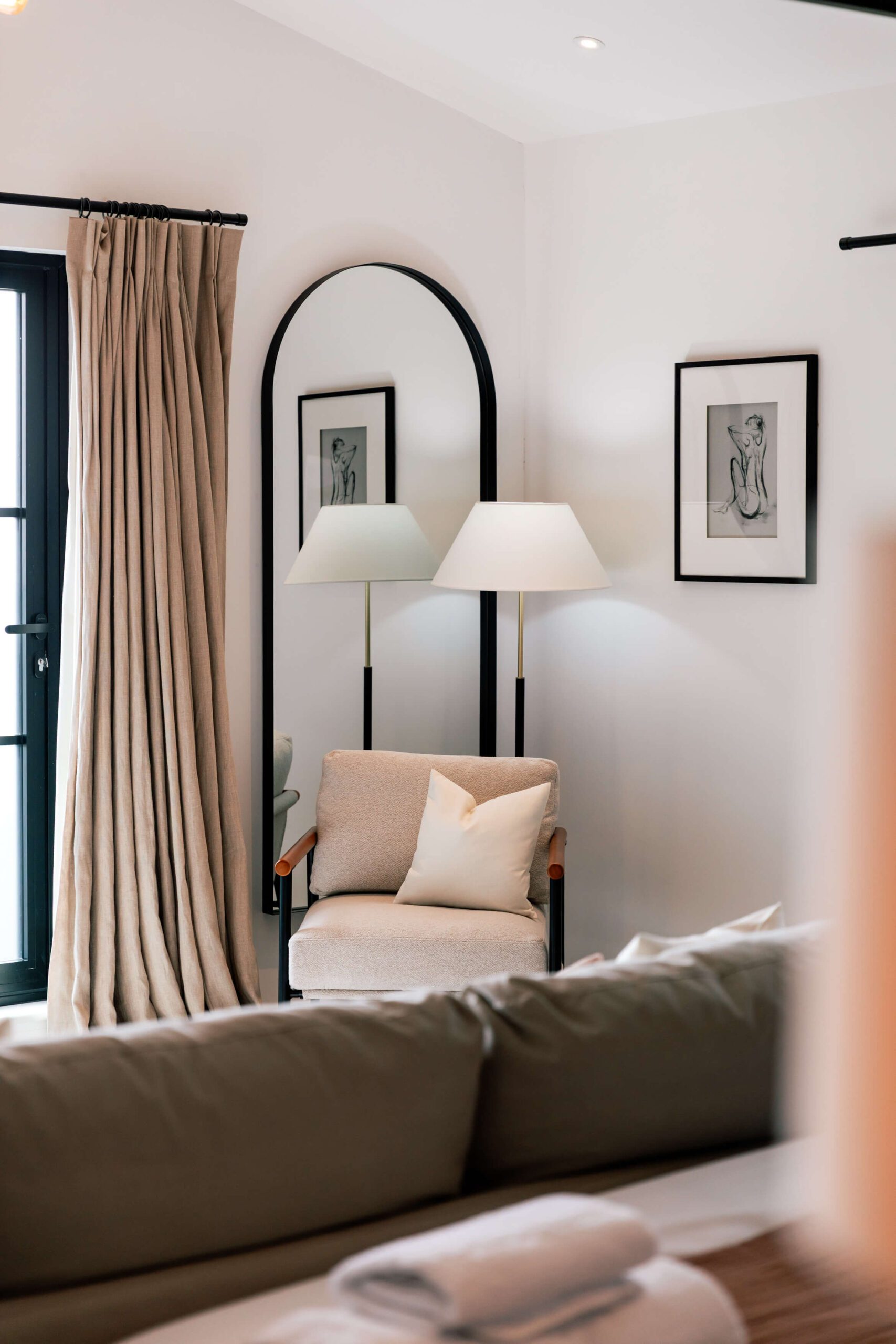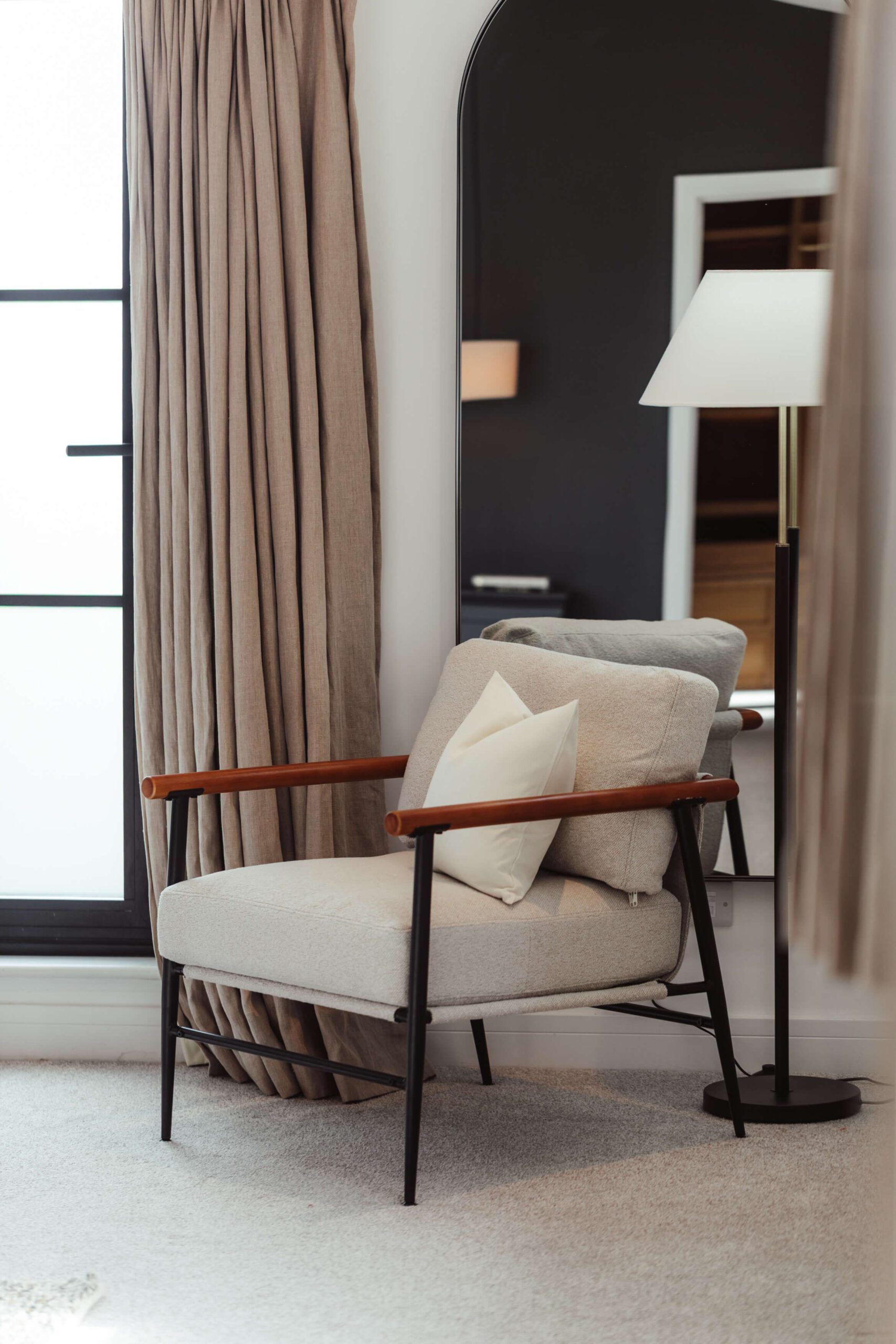 The client wanted a luxurious hotel feel that still offered the warmth and comfort of home. We embraced the room’s high ceilings to make the bed a dramatic centerpiece, layered textured rugs for depth, and incorporated black furniture to complement the striking black crittal windows, creating a cohesive and inviting space.